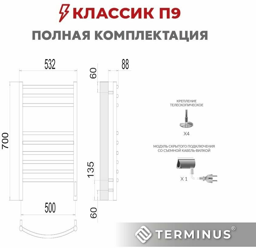 Полотенцесушитель электрический Terminus Классик П4 4670078544483 550x532, ТЭН правый, хром 8 999 ₽ Подробнее