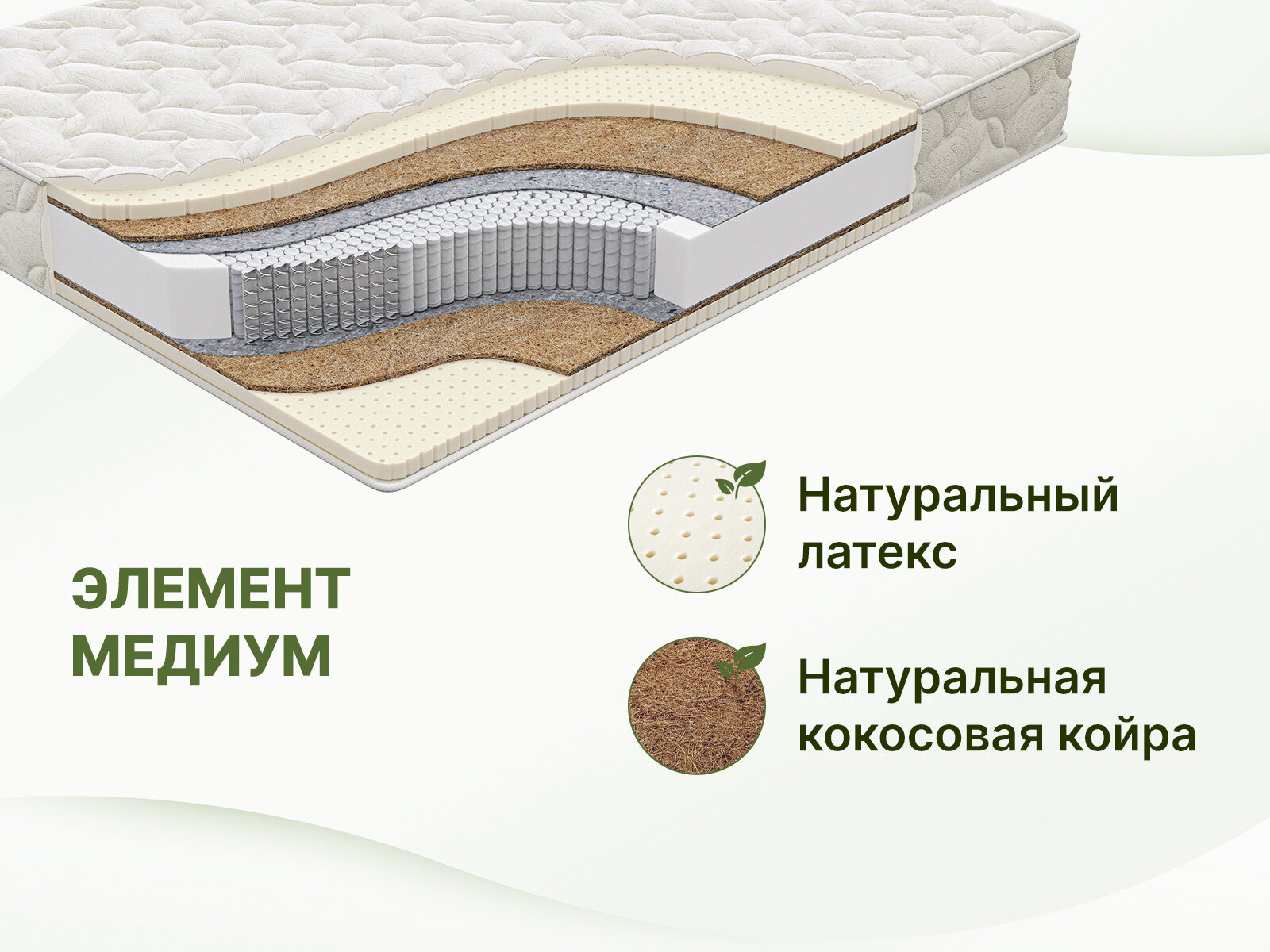 Лучшие цены. Ортопедический пружинный матрас Элемент Медиум со средней жесткостью и премиальным пружинным блоком - идеальный выбор для тех, кто ценит комфорт и натуральные материалы. Наполнителем ортопедического пружинного матраса является комбинация койры и латекса, которые обеспечивают ортопедическую поддержку позвоночника и адаптацию к форме тела. Оба материала являются натуральными и обеспечивают хорошую вентиляцию и воздухообмен внутри матраса. Магазины в вашем городе.