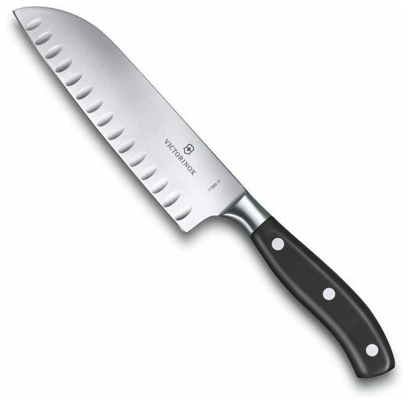 Лучшие цены. Нож сантоку VICTORINOX Grand Maître, кованый, рифлёное лезвие из нержавеющей стали 17 см, рукоять из полиоксиметилена чёрного цвета. Сантоку - это японский вариант кухонного ножа общего назначения. Он прекрасно подходит для нарезки, рубки и фаршировки; но его самый большой талант - разносторонность, а его истинная специализация - делать все хорошо. Благодаря особой форме и превосходному балансу, вы обнаружите, что сантоку является настоящим универсалом, которым приятно пользоваться изо дня в день. Магазины в вашем городе.