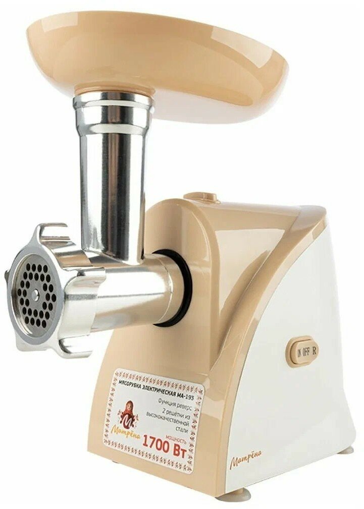 Лучшие цены. Мясорубка электрическая Матрена МА-193 оснащена мотором с высокой мощностью 1700 Вт и функцией реверс. Номинальная мощность мясорубки 400 Вт позволяет быстро измельчить мясо, овощи и другие продукты для приготовления котлет, кебабов и других продуктов. Нож из нержавеющей стали равномерно измельчает все виды мяса. Корпус из прочного бежевого пластика оснащен ручкой для переноски прибора и ножками, препятствующими скольжению. Магазины в вашем городе.