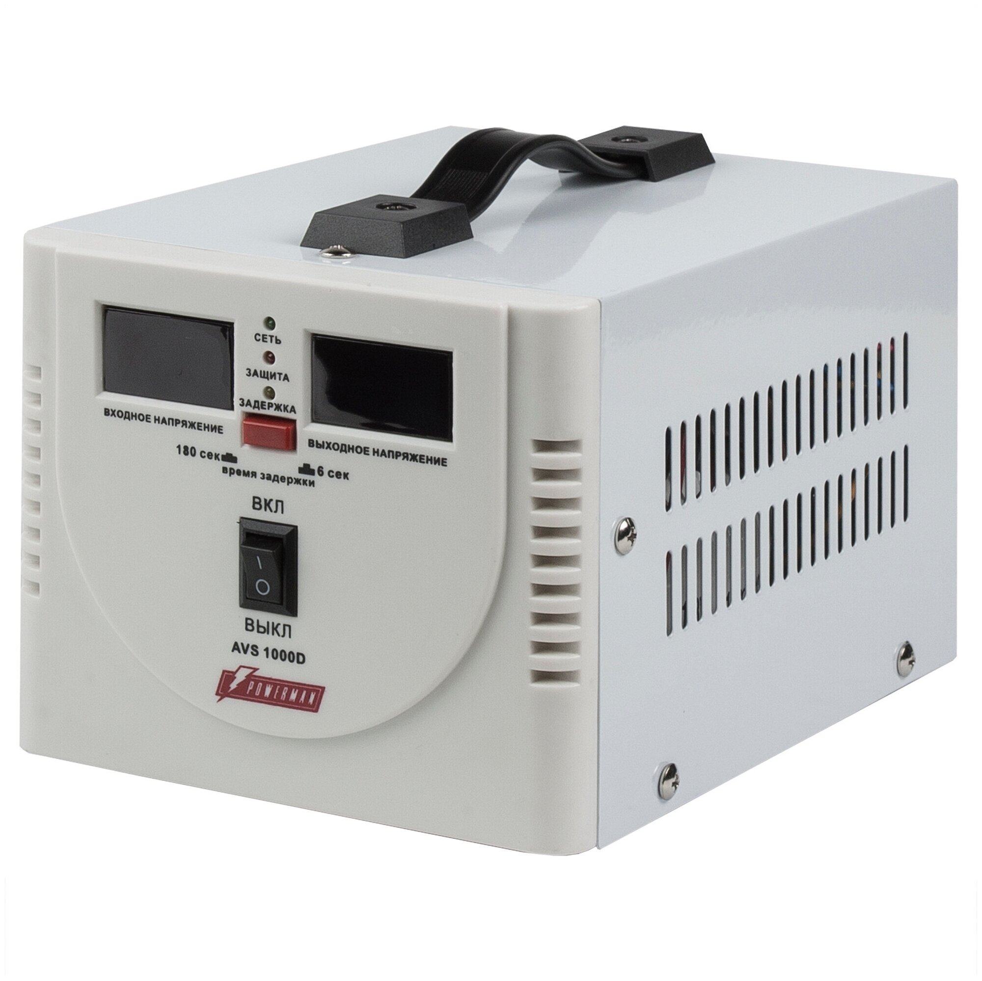 Лучшие цены. Стабилизатор напряжения Powerman ", AVS 1000 D", однофазный стабилизатор мощностью 1000ВА. Обеспечивает для подключенного оборудования уровень напряжения 220В (отклонения не превышают допустимые по ГОСТ 32144-2013 ", Нормы качества электрической энергии",). В диапазоне напряжений сети 140В - 260В обеспечивает выходное напряжение 220В ± 8%. При слишком высоком или слишком низком напряжении сети, которое стабилизатор не может компенсировать, а также при значительной перегрузке он отключает. Магазины в вашем городе.