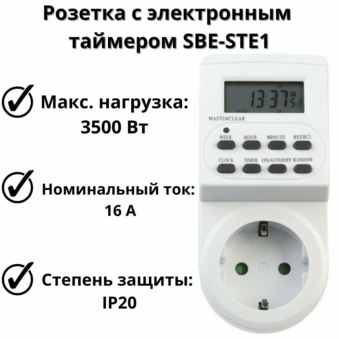 Розетка SmartBuy SBE-STE1 с таймером электронным (недельный+суточный), 16 А, с защитной шторкой, с заземлением