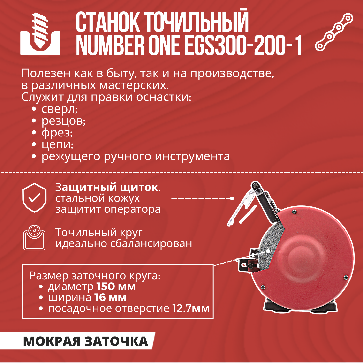 Лучшие цены. Точильный станок NUMBER ONE EGS300-150-1 предназначен для затачивания ножей, фрез, зубцов дисков или зубьев пилы. Практичное, безопасное оборудование нужно в частном хозяйстве, ремонтных мастерских. Современная модель в металлическом корпусе отличается простотой конструкции, не требует профессионального техобслуживания. Станки точильные оснащены надежными, выносливыми асинхронными электрическими двигателями с короткозамкнутым ротором. Такие моторы долго и бесперебойно служат, практически вечные. Магазины в вашем городе.