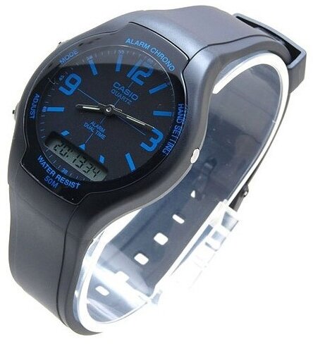 Лучшие цены. Мужские наручные часы Casio AW-90H-2B , где батарейка запускает механизм в действие. Корпус пластиковый с светлым циферблатом и пластиковым стеклом, браслет пластиковый. Модель Casio AW-90H-2B обладает степенью влагостойкости 50 м (5 АТМ), где допустимо кратковременное погружение в воду, для плавания рассмотрите варианты от 100 м (10 АТМ). Циферблат подсвечивается люминесцентной подсветкой, которая накапливает световой элемент при свете и светится в темноте. Магазины в вашем городе.
