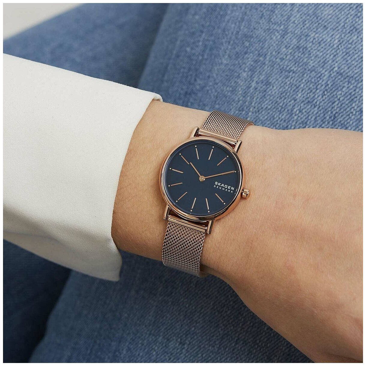 Лучшие цены. Женские наручные часы Skagen Signature на браслете миланского плетения. Гарантия 2 года. Категория: Миланское плетение Комплектация: Часы, фирменная упаковка, инструкция на русском языке, заполненная международная гарантия Бренд Skagen Пол Женские Страна Дания Коллекция Signature Вид механизма Кварцевые часы Тип браслета/ремешка Нержавеющая сталь Корпус Нержавеющая сталь Стекло Минеральное Водозащита WR 30 Цвет браслета/ремешка Розовое золото Ширина ремешка 14 Диаметр 30 мм. Толщина мм 6 мм. Магазины в вашем городе.