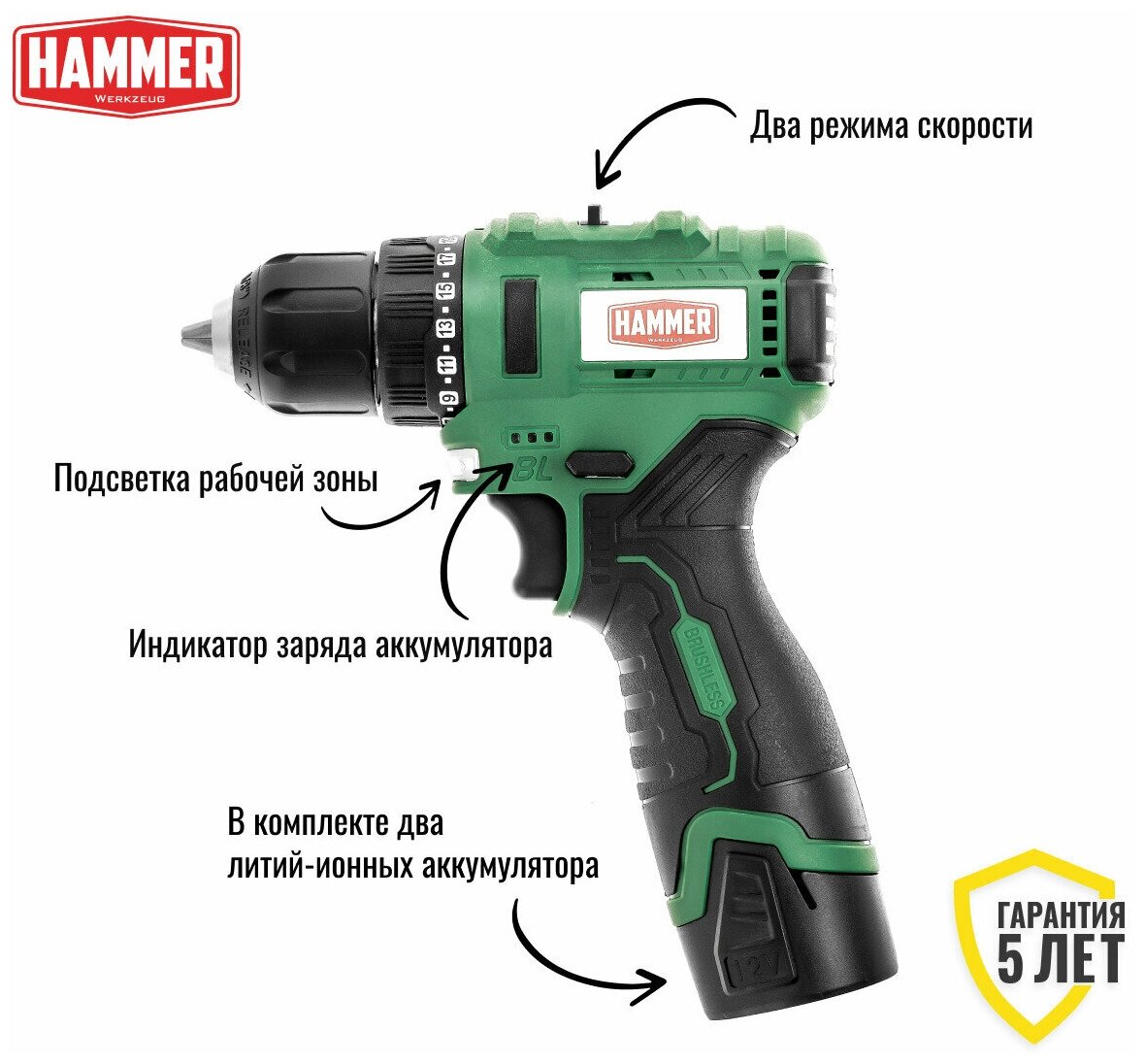 Лучшие цены. HAMMER ACD12BLC — аккумуляторная дрель-шуруповёрт, предназначена для работы с различным крепежом. Сверлит отверстия диаметром до 25 мм в дереве и до 8 мм в металле. Работает от Li-Ion батареи 12 В ( два аккумулятора входят в комплект). • Максимальные обороты: 1350 об/мин • Крутящий момент: 32 Нм • Положений закручивания: 21 • Гарантия: 5 лет Особенности модели ACD12BLC: Дрель оснащена бесщёточным двигателем. Это увеличивает КПД и позволяет экономно расходовать заряд батареи. Магазины в вашем городе.