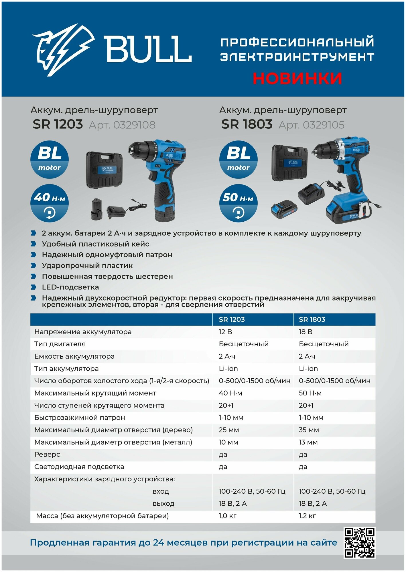 Bull Дрель-шуруповерт аккумуляторная SR 1803 0329105 .