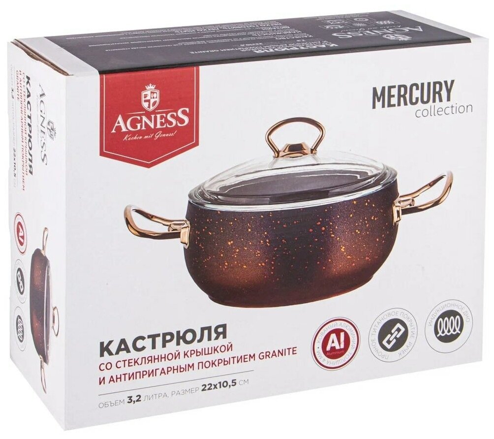 Лучшие цены. Кастрюля с антипригар. покрытием granite, серия mercury, 22х10,5см, 3,2л, pfoa free Agness (953-003) Марка AGNESS представляет посуду турецкого производителя серии Mercury. Серия Mercury - это идеальное сочетание традиций и современных технологий. Необычная округлая форма и утолщенные стенки позволяют сохранить тепло внутри посуды и создают эффект томления. Это наилучший способ готовить полезные и вкусные блюда, максимально сохраняя всю пользу и оттенки вкуса. Посуда выполнена из кованного алюминия. Магазины в вашем городе.
