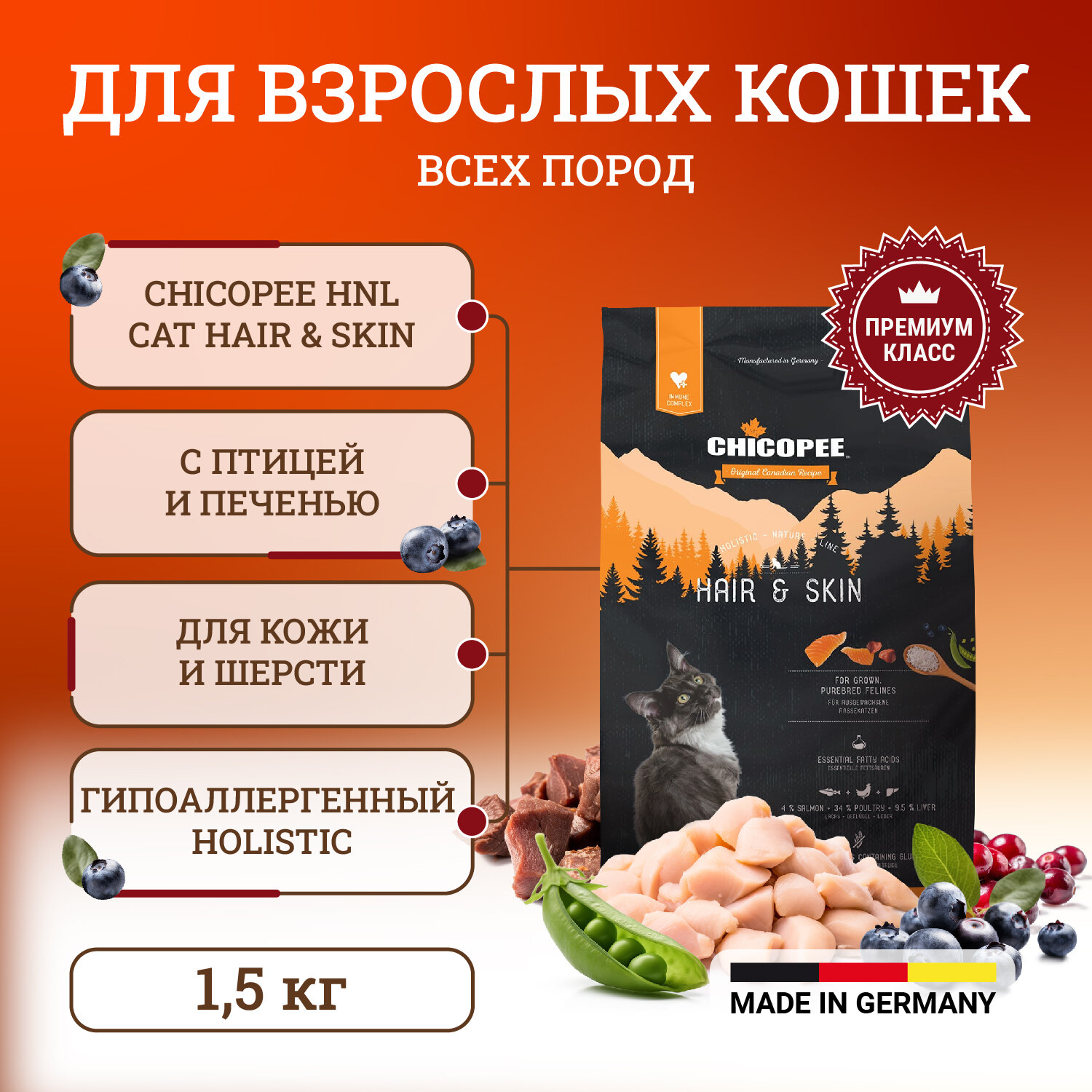 Корм для кошек Chicopee HNL Cat Hair & Skin сухой корм для кошек для кожи и шерсти - 1,5 кг