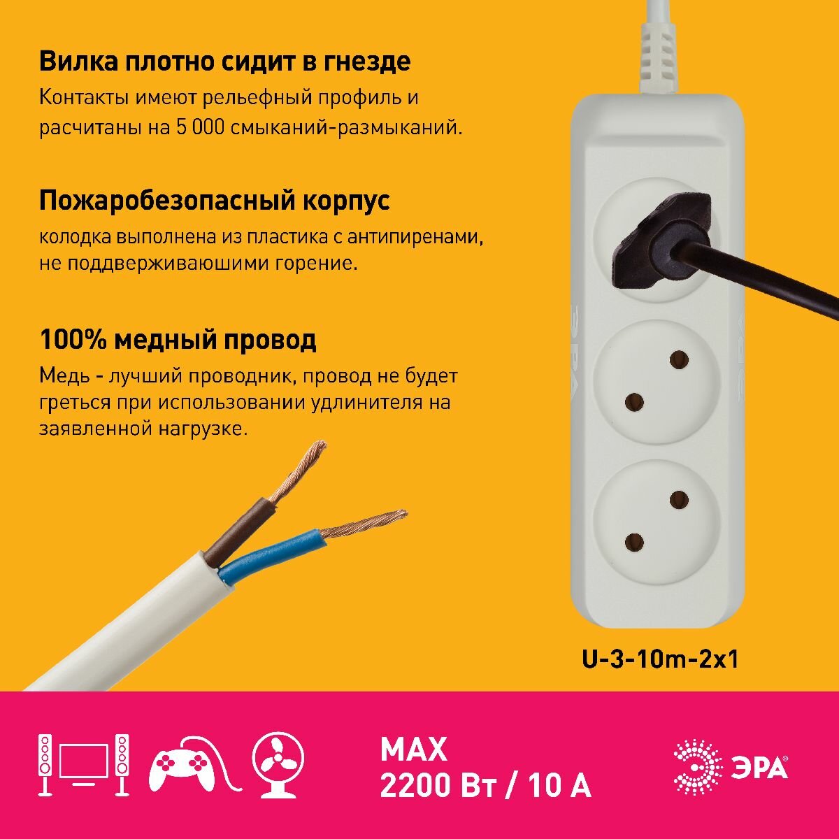 ЭРА сетевой удлинитель ПВС 2х1 3 розетка 10 м 10А/2200Вт (корпус негорючий PP) U-3-10m (РФ) 3572