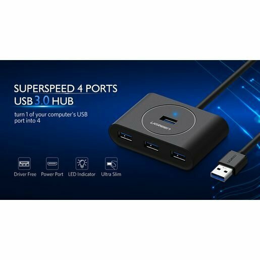 UGREEN. USB концентратор (хаб) 4 х USB 3.0, 1 м, цвет черный (20291)