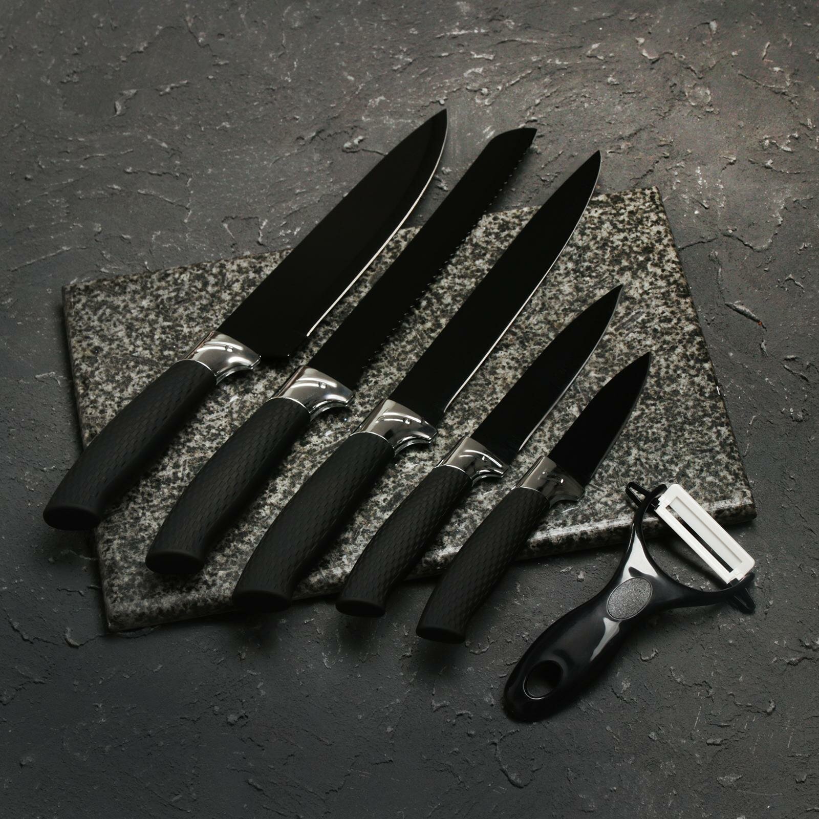 Набор "Тень", 6 предметов: ножи 19 см, 23 см, 32 см, 32 см, керамическая овощечистка, 32х4 см, цвет чёрный