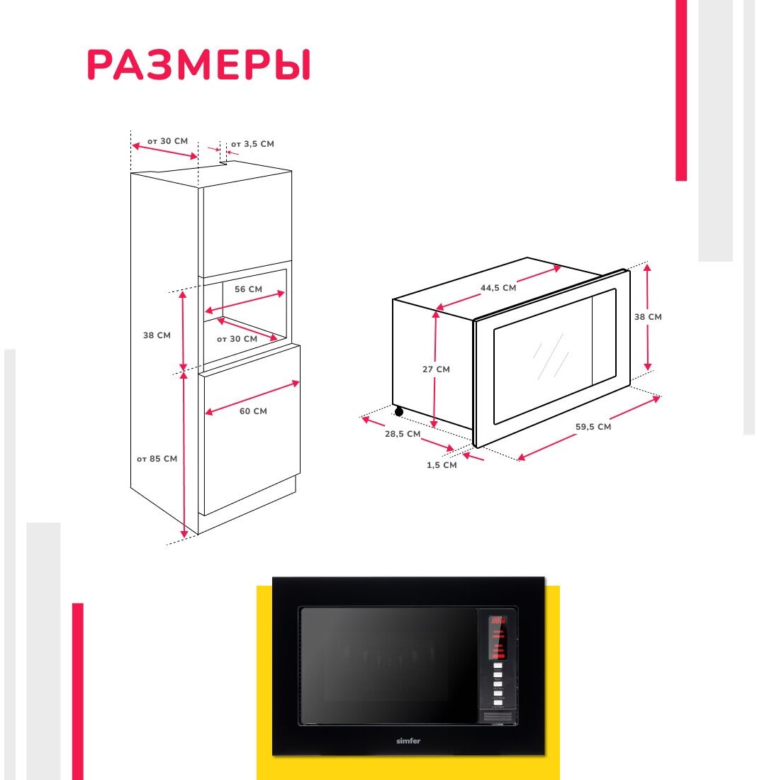 Лучшие цены. Встраиваемая микроволновая печь Simfer MD2220 - это модель способна, не занимая лишнего места, гармонично вписаться в дизайн любой кухни, даже самой маленькой и подчеркнуть ее стиль. С помощью печи можно не только разогреть блюдо, но и разморозить продукты, приготовить супы, пожарить и потушить мясо, овощи, и даже испечь вкусные пирожки. Гриль добавит хрустящую корочку любому вашему кулинарному шедевру. Магазины в вашем городе.