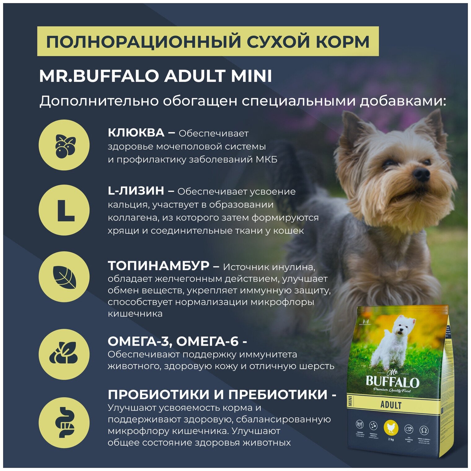 Лучшие цены. Описание Корм для собак сухой полнорационный премиум класса для миниатюрных пород Mr. Buffalo MINI с курицей. Рацион создан в соответствии с особыми потребностями собак миниатюрных пород. Корм для собак сухой Мистер Баффало содержит оптимальное количество белков, жиров и углеводов, что делает корм для собак подходящим для мелких и миниатюрных пород. Именно на потребности мелких и миниатюрных пород собак рассчитан и витаминно-минеральный премикс. Магазины в вашем городе.