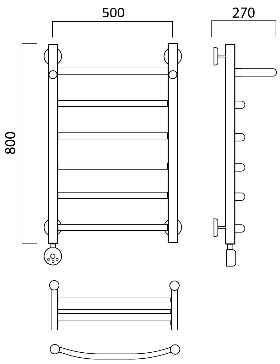 Лучшие цены. Электрический полотенцесушитель Акванерж дуга с полкой 700x500 левый Предназначен для сушки тканевых изделий, обогрева ванных и душевых комнат и поддержания нормального микроклимата в ванной комнате. Температура в рабочем режиме 55С +-10, регулируется терморегулятором от 30С до 70С. Двойная система предохранения, автоматическое отключение и включение прибора для экономии электроэнергии. От перегревания ограничитель температуры отключает нагревательный элемент. Средняя потребляемая мощность 100 - 150W. Магазины в вашем городе.