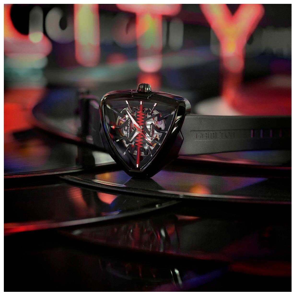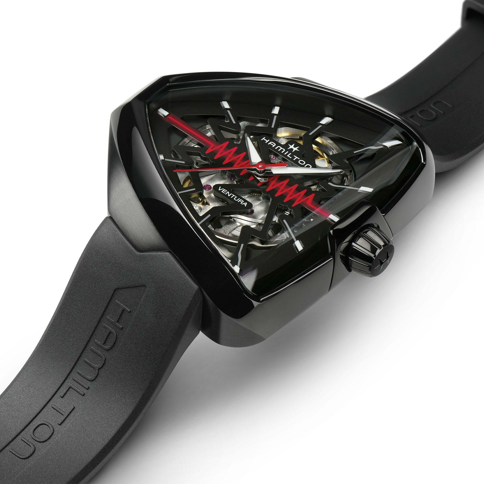 Лучшие цены. В смелом дизайне Ventura Elvis80 Skeleton отражено прошлое, настоящее и будущее первых в мире электрических часов. Эффектная интерпретация революционной модели, эта модель в гладком черном корпусе треугольной формы с PVD-покрытием дополнена скелетонизированным циферблатом с красным зигзагом в центре. Деталь в форме молнии воспевает легендарный символ новаторства и привлекает внимание к расположенному ниже механизму с автоматическим подзаводом H-10-S. Магазины в вашем городе.