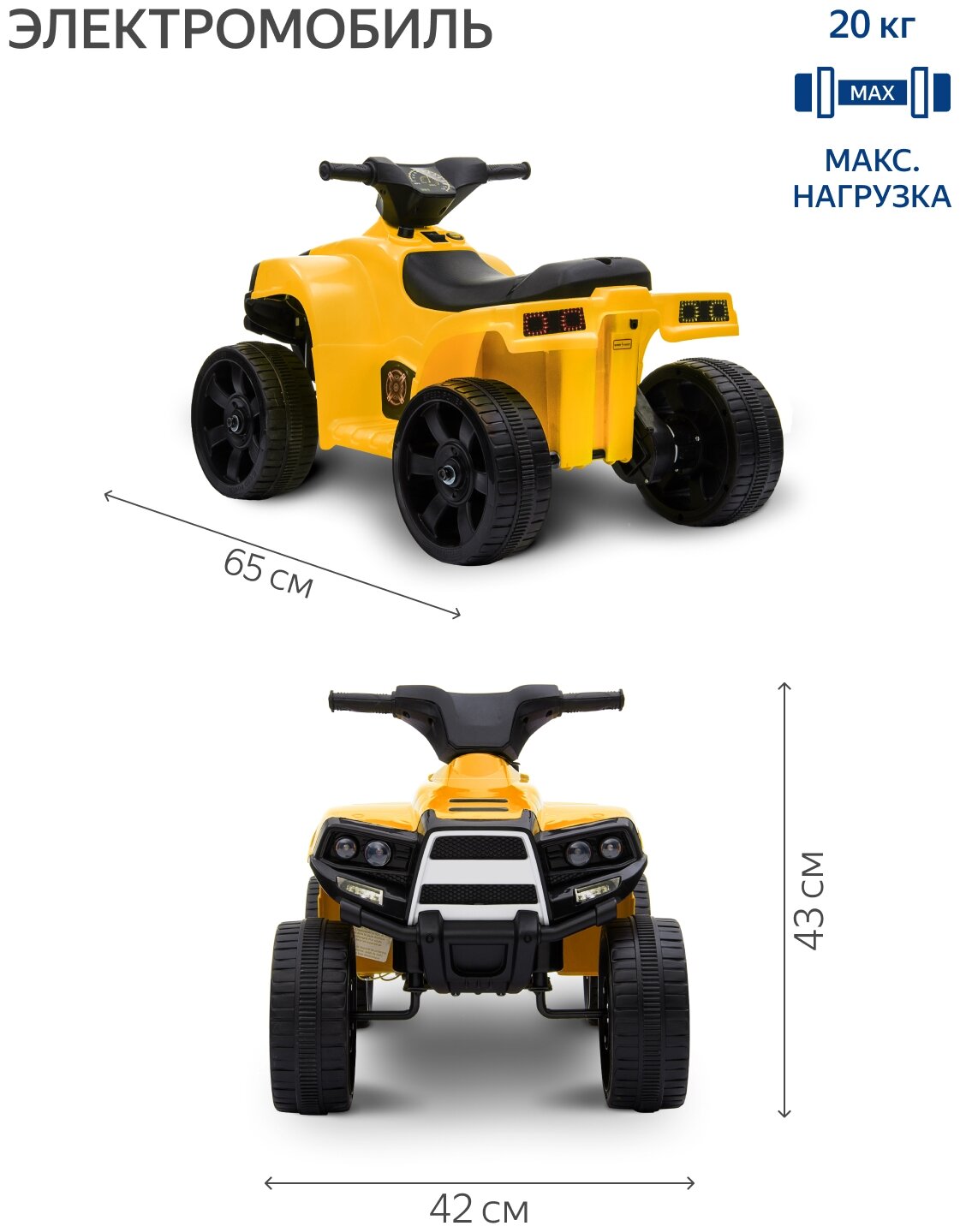 Лучшие цены. Квадроцикл 8820017B предназначен для самых маленьких — он подходит детям от 3 до 8 лет и выдерживает вес до 20 кг. Яркий дизайн, подсветка и звуковые эффекты надолго привлекут внимание малышей, а простое управление — квадроцикл ездит вперёд и назад — гарантирует, что любой ребёнок справится с поездкой. Благодаря небольшому весу — всего 5 кг — квадроцикл удобно брать на прогулки. Маленькие габариты квадроцикла позволяют кататься на нём и в помещении. Магазины в вашем городе.