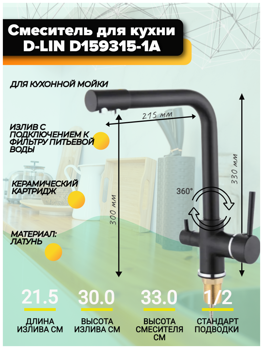Смеситель для кухни D-LIN D159315-1A с подключением к фильтру с питьевой водой, черный . 8 159 ₽ Подробнее