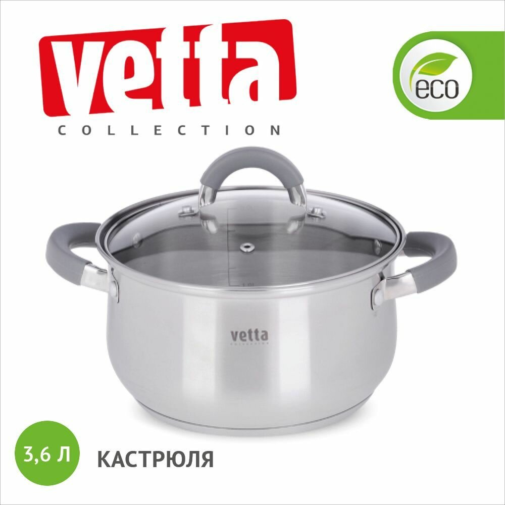 Кастрюля 3,6 л Vetta "Вена" со стеклянной крышкой, нержавеющая сталь, индукция