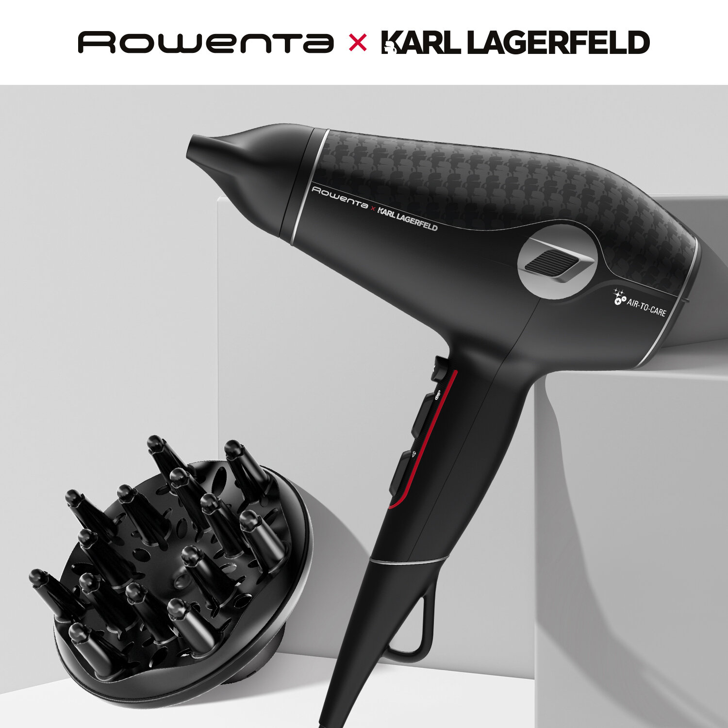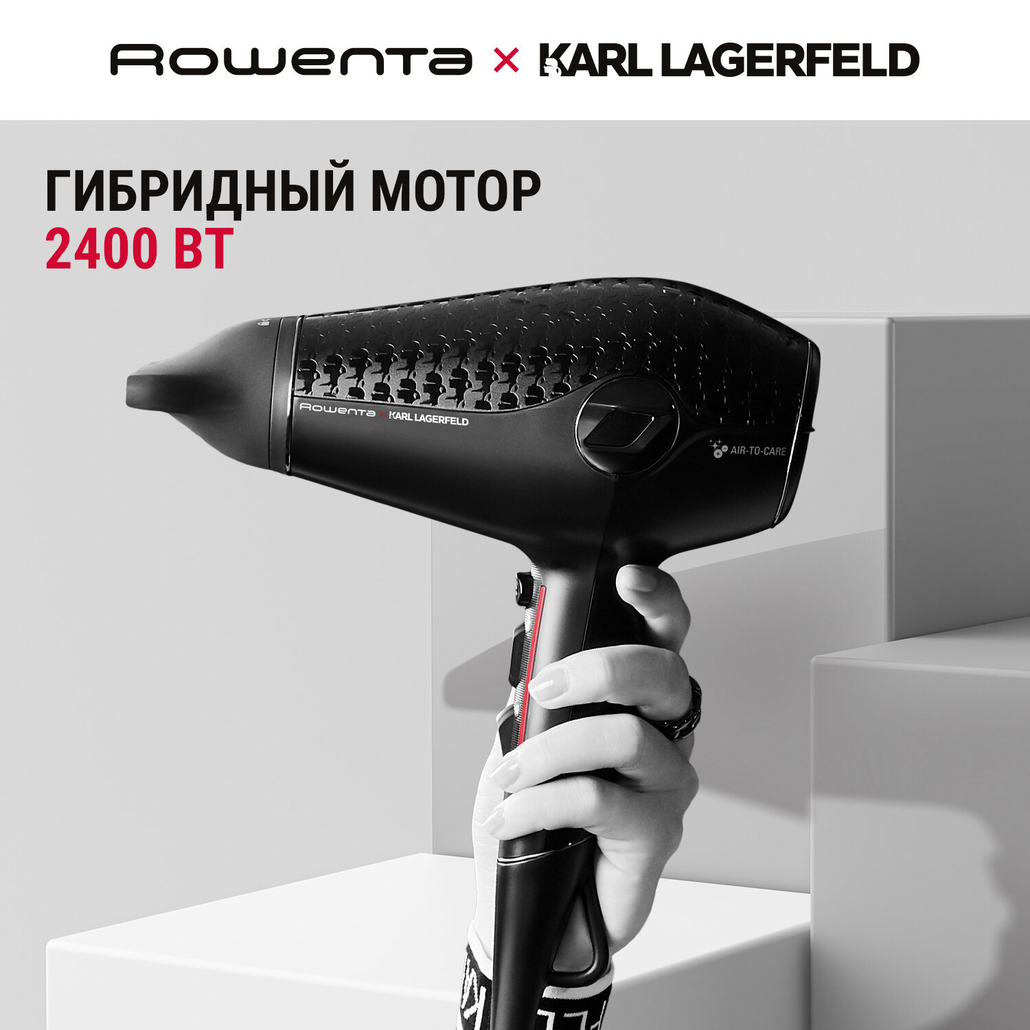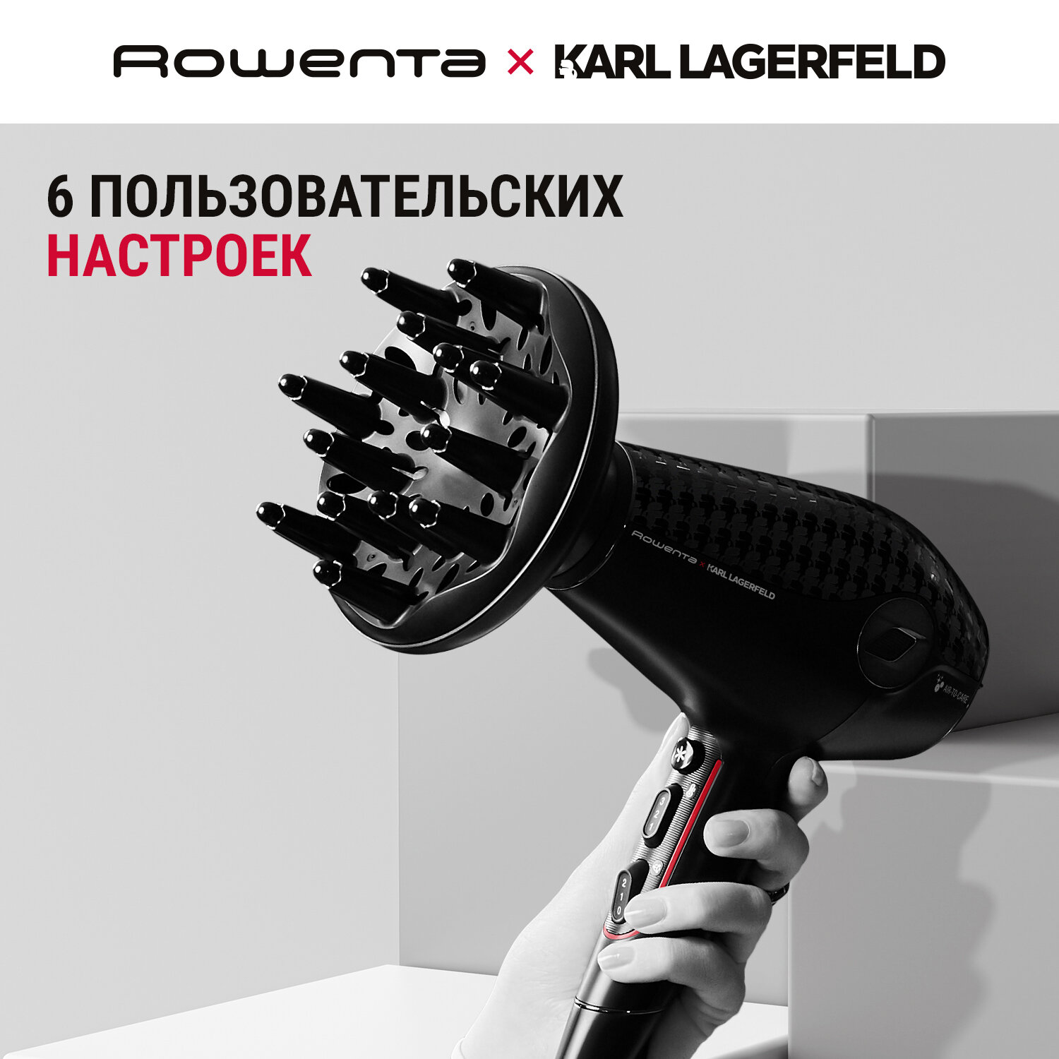 Фены и приборы для укладки Фен для волос Rowenta Karl Lagerfeld CV613LF0 черный/розовый, 1800 Вт, AC мотор, съёмная задняя решётка, ультра-холодный воздух, диффузор в комплекте