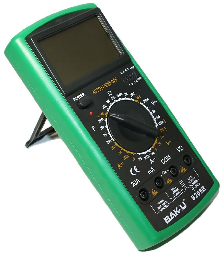Лучшие цены. Мультиметр BAKU BK-9205B - компактный, износостойкий, точный, предназначен для контроля постоянного и переменного напряжения, постоянного тока, сопротивления, емкости, проверки диодов и транзисторов, прозвонка. Большой LCD дисплей. Индикация выхода за установленный предел измерения. Индикатор разряда батареи. Функция запоминания измеренной величины (HOLD). Автоматическая индикация отрицательной полярности. Защита от перегрузки во всех режимах измерения. Режим прозвонки со звуковой индикацией. Магазины в вашем городе.