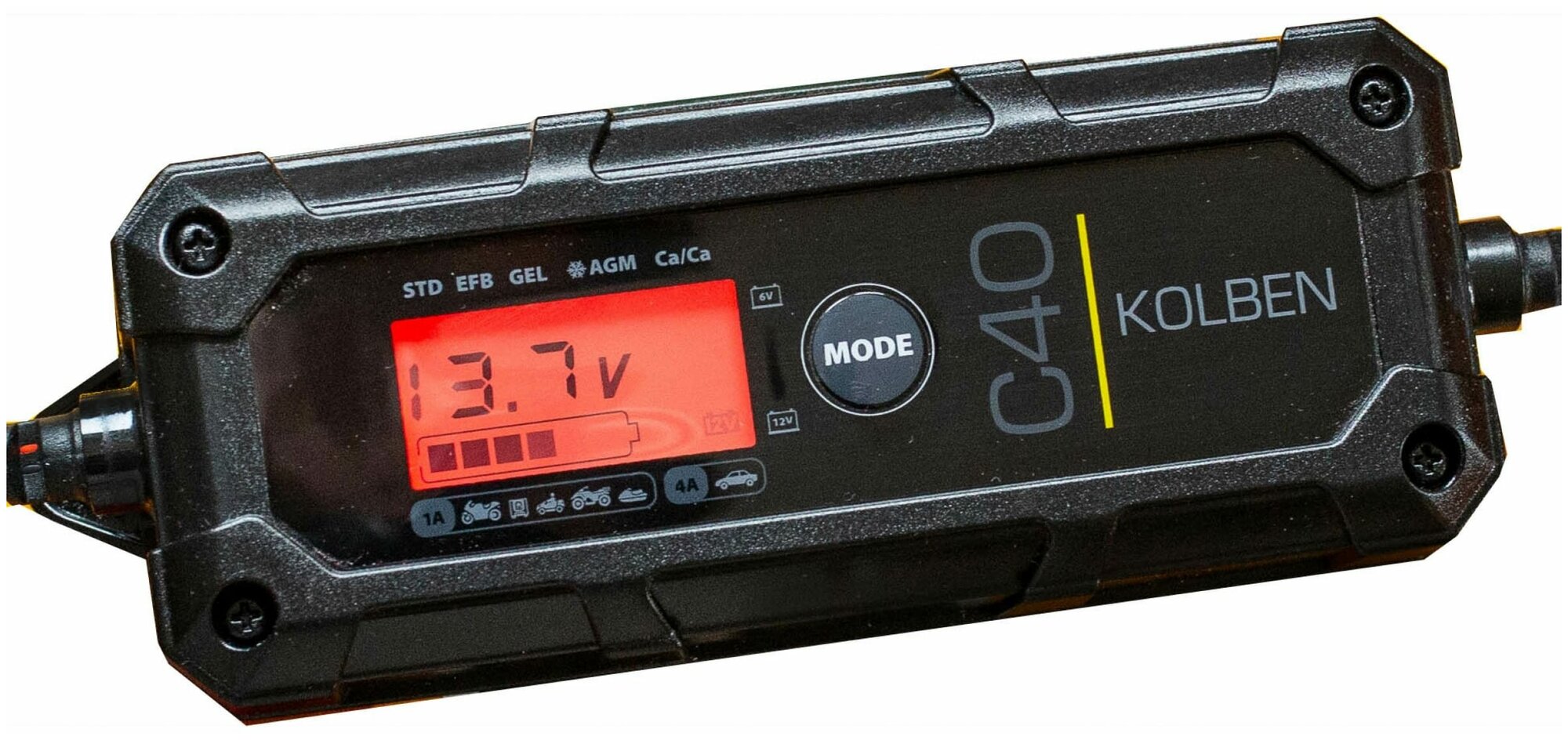 Лучшие цены. Зарядное устройство Battery Service Kolben 6/12В, 1А/4А KB-C40 предназначено для свинцово-кислотных аккумуляторов. Предусмотрен режим эффективной зарядки для современных кальциевых аккумуляторов, продлевающий жизненный цикл батарей, применяемых в ИБП (UPS), детских электромобилях, мотоциклах, квадроциклах, гидроциклах, легковых авто. Предназначен для аккумуляторов следующих типов: STD(WET), START-STOP(EFB), GEL, AGM, Ca/Ca. Магазины в вашем городе.