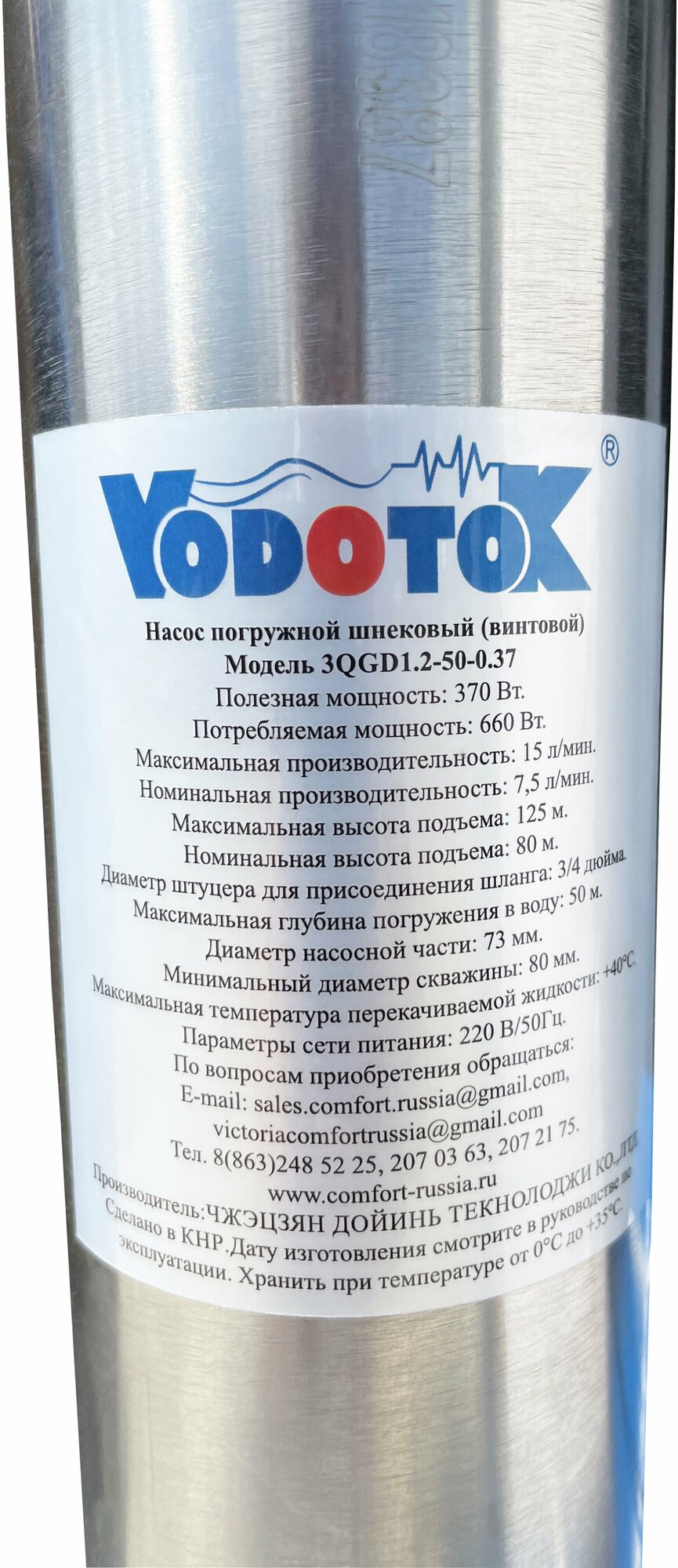 Скважинные насосы Насос погружной скважинный винтовой Vodotok 3QGD 1.2-50-0.37 (370 Вт, 1200л/ч, 125м, диаметр 75мм)