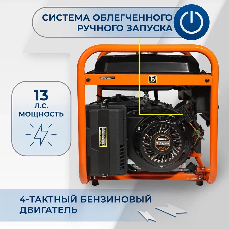 Лучшие цены. Название товара: Бензиновый генератор ELECTROLITE 6000S, 5-6 кВт. Это однофазный генератор, который станет отличным выбором для тех, кто ищет надежное и экономичное решение для автономного электроснабжения. Бренд ELECTROLITE существует на рынке уже более 10 лет и зарекомендовал себя как производитель качественных и доступных генераторов. Модель 6000S - это надежный генератор мощностью 5-6 кВт, который подходит для использования в удаленных местах, где нет доступа к электричеству. Магазины в вашем городе.