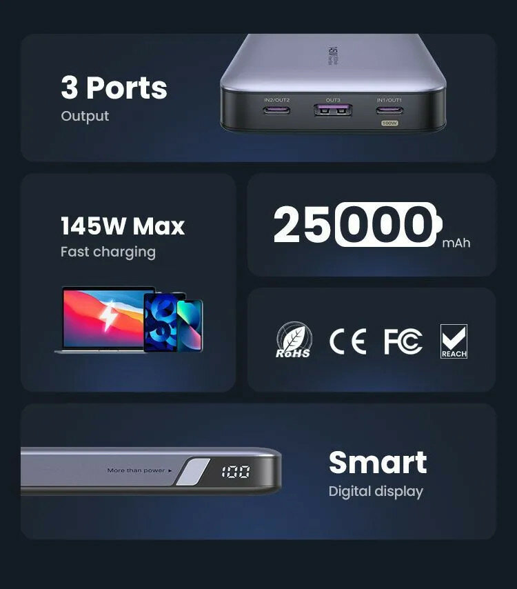 Powerbank Внешний аккумулятор UGREEN PB205 (90597A) PD 145W Power Bank 25000 мАч тёмно-синий (Abyss Blue)