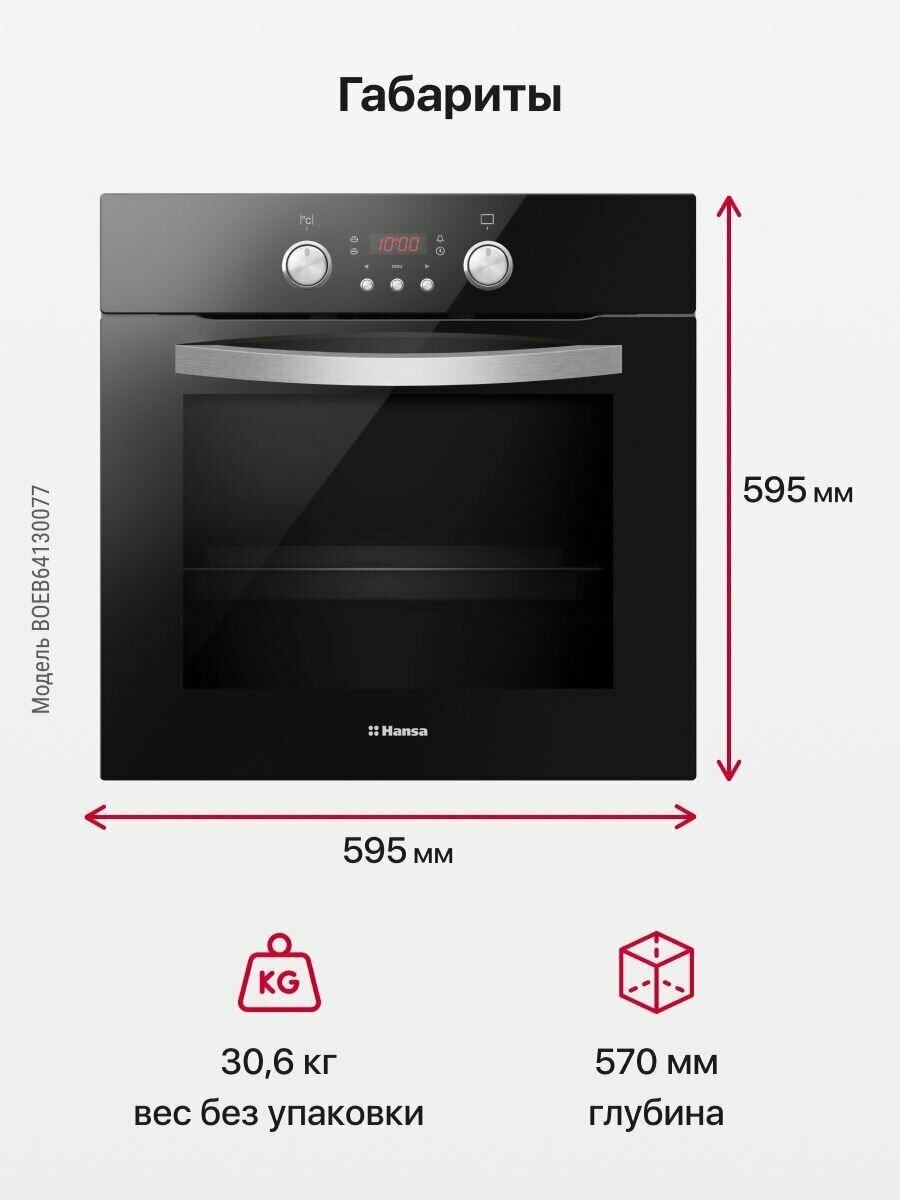 Электрический духовой шкаф Hansa встраиваемый BOEB64130077, 60см, с грилем и улучшенной конвекцией, с быстрым нагревом, с таймером, двойное жаропрочное стекло