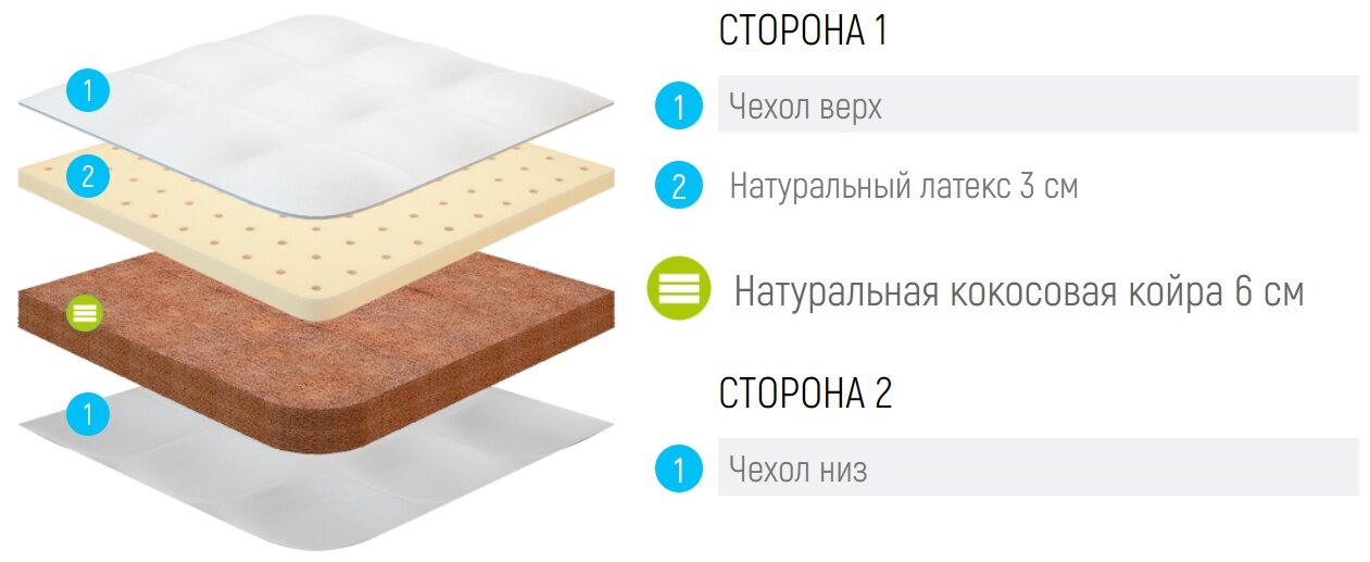 Лучшие цены. Беспружинный матрас Baby Latex-Cocos состоит полностью из натуральных материалов высокого качества. Латекс расположен с одной стороны плитой в три см. высотой. Койра кокоса сложена из двух плит по три см. толщиной каждая. Все слои в матрасе надежно скреплены между собой, что исключает их соскальзывание со временем. мягкая латексная сторона подойдет для деток постарше, латекс расслабляет позвоночник, не нарушая анатомии тела. Магазины в вашем городе.