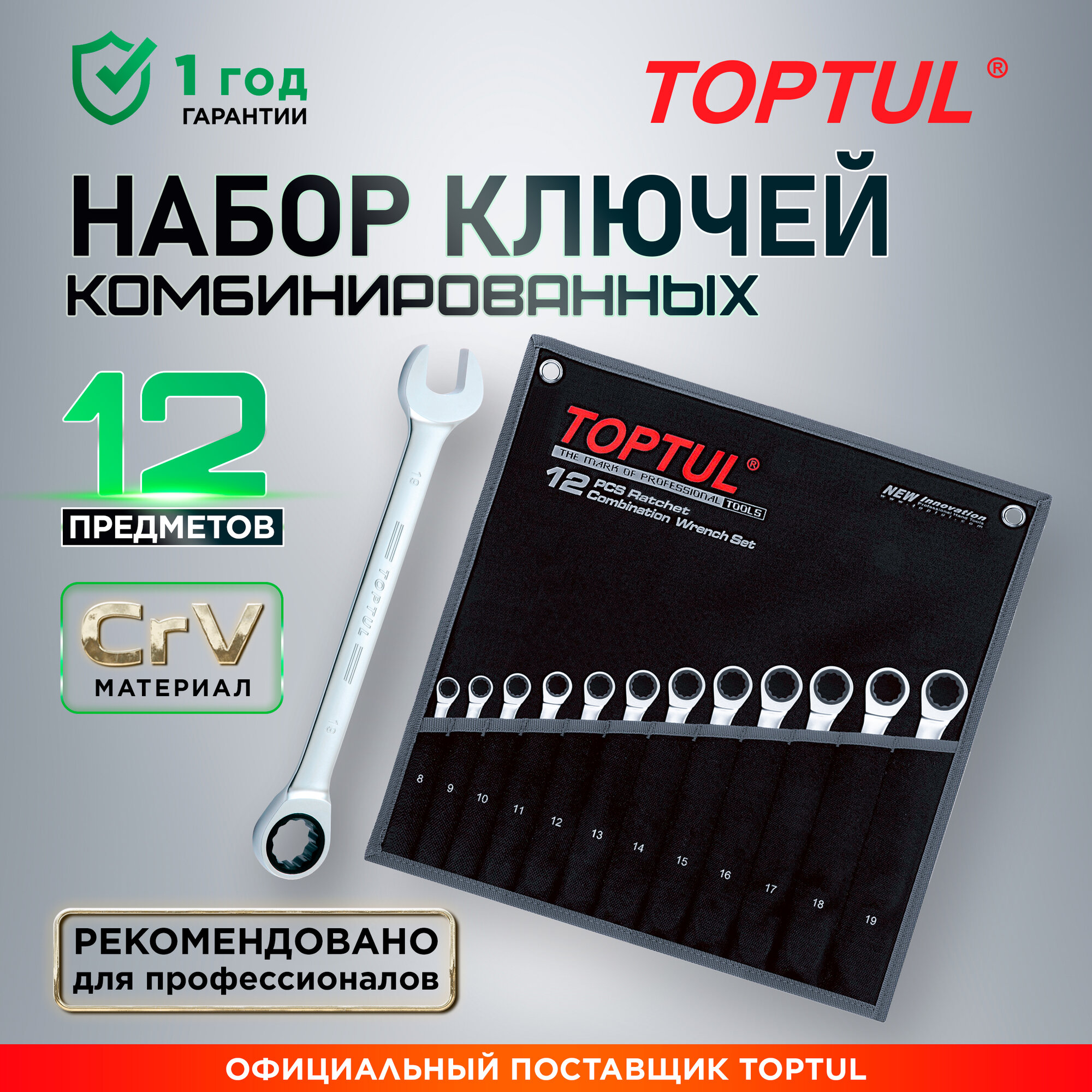 Набор инструментов Набор ключей комбинированных 8-19 мм 12 предметов с трещоткой TOPTUL (GPAQ1202)