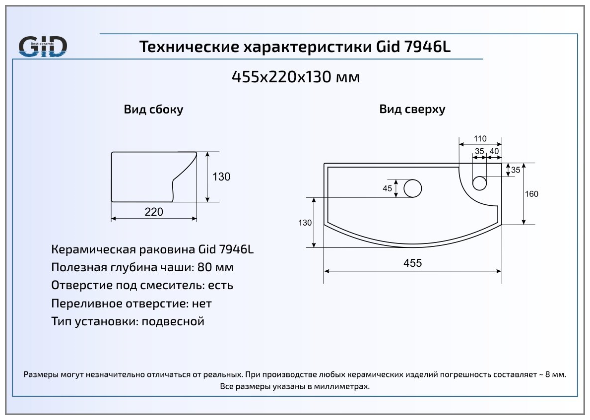 Раковина накладная GID 7946L 45.5 чаша слева/белая глянцевая 5 050 ₽ Подробнее