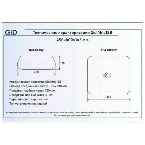 Накладная раковина 45x40х14.5 см, Gid, Mnc188 6 600 ₽ Подробнее