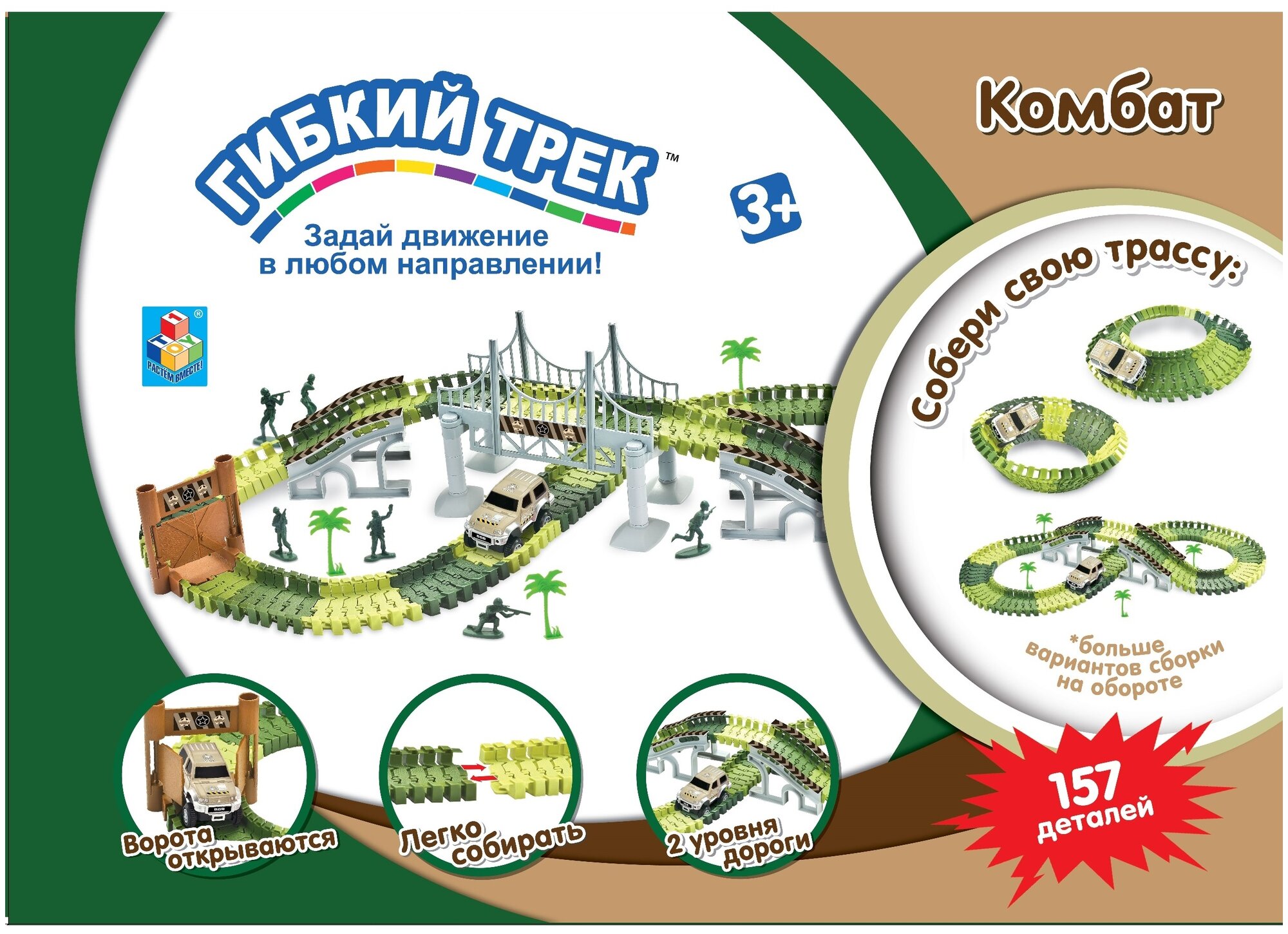 Лучшие цены. Гибкий трек Комбат (182 детали) разработан специально для юных защитников отечества. Детали трека позволяют создавать собственную двухуровневую трассу, комбинируя возможные варианты. Детали трека гибкие, из них можно создать не просто круглую или прямую трассу, а сделать ее вогнутой или «закольцевать», заставив машинку ехать внутри нее. На трассе расположены: подвесной мост, открывающиеся ворота. Машинка, входящая в комплект, при включении начинает самостоятельно двигаться по треку с большой скоростью. Магазины в вашем городе.