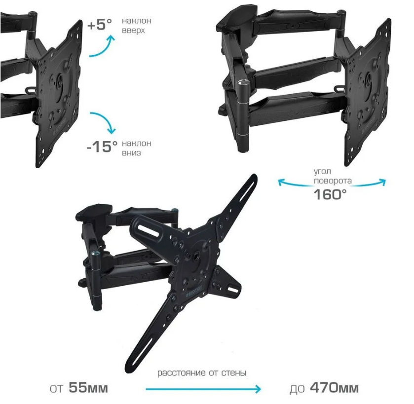 Кронштейны для техники Kromax Кронштейн настенный Kromax ATLANTIS-45 22-65" (наклон -15°/+5°, поворот 160°, до 45 кг, серый) 4 290 ₽ Подробнее