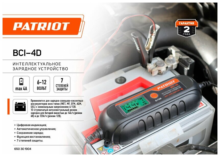 Зарядное устройство PATRIOT BCI-4D, 4А, 120 А*ч / автомобильная зарядка для аккумуляторов / для акб
