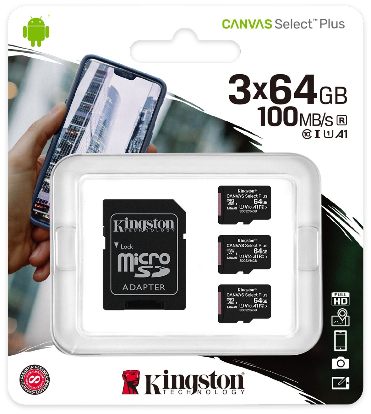 Комплект 3 шт, Карта памяти microSDXC 64 GB KINGSTON Canvas Select Plus, UHS-I U1, 100 Мб/с (class 10), адаптер, SDCS2/64GB