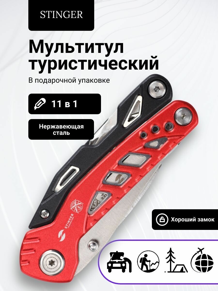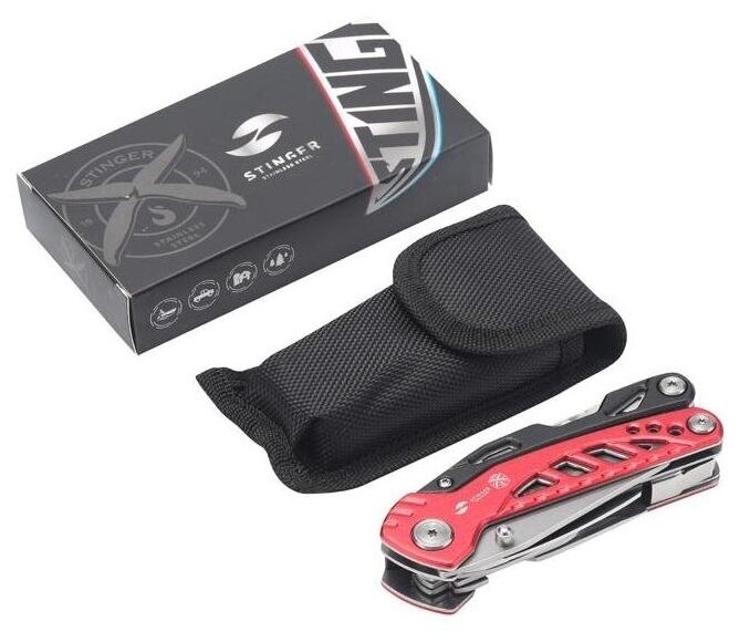 Мультитул Stinger, 107x37 мм, 11 функций, сталь/алюминий, красно-чёрный, в нейлоновом чехле