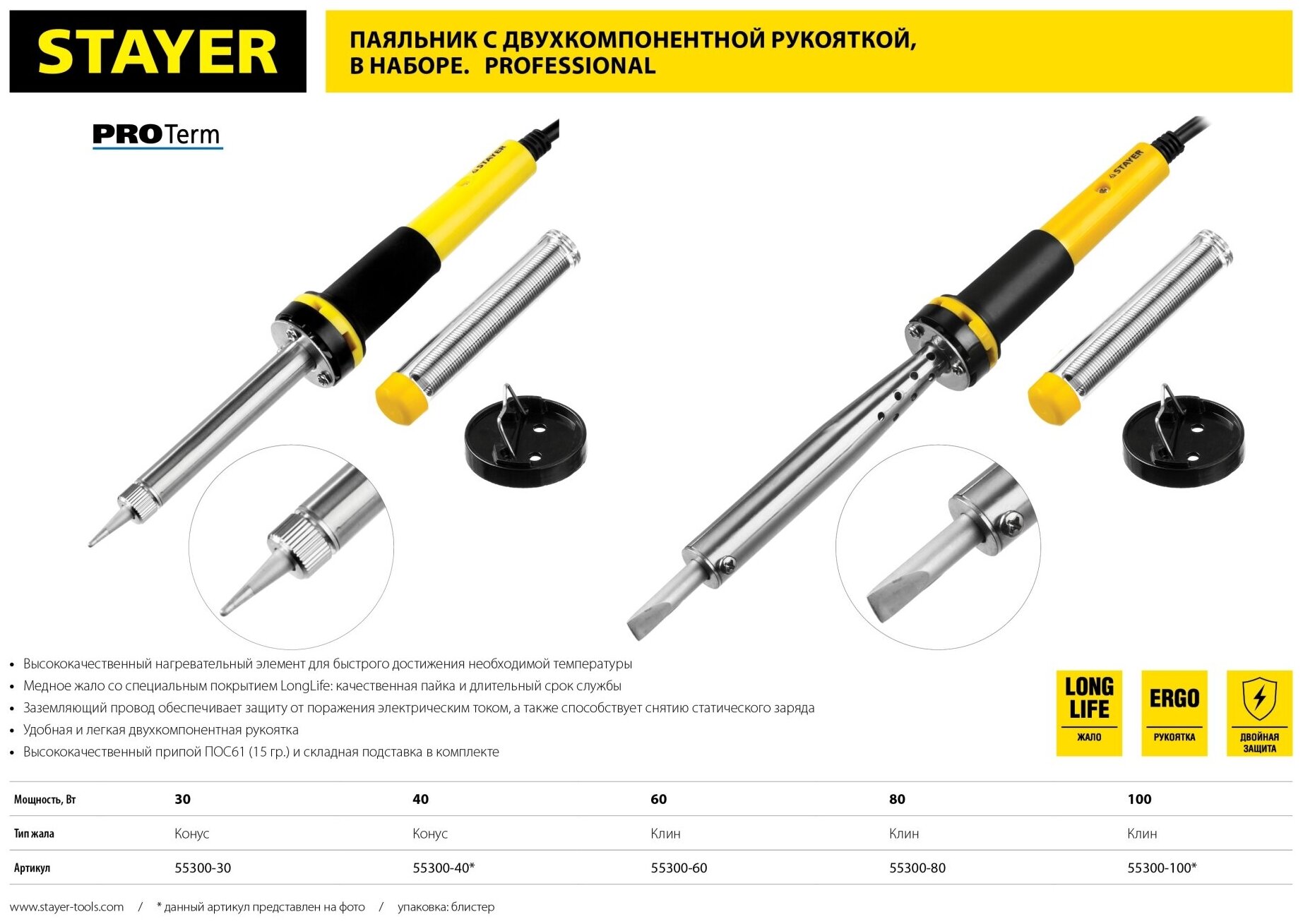 Паяльник с двухкомпонентной рукояткой и долговечным жалом, STAYER "PROFI" PROTerm, 55300-30, в комплекте (припой и подст электротовар