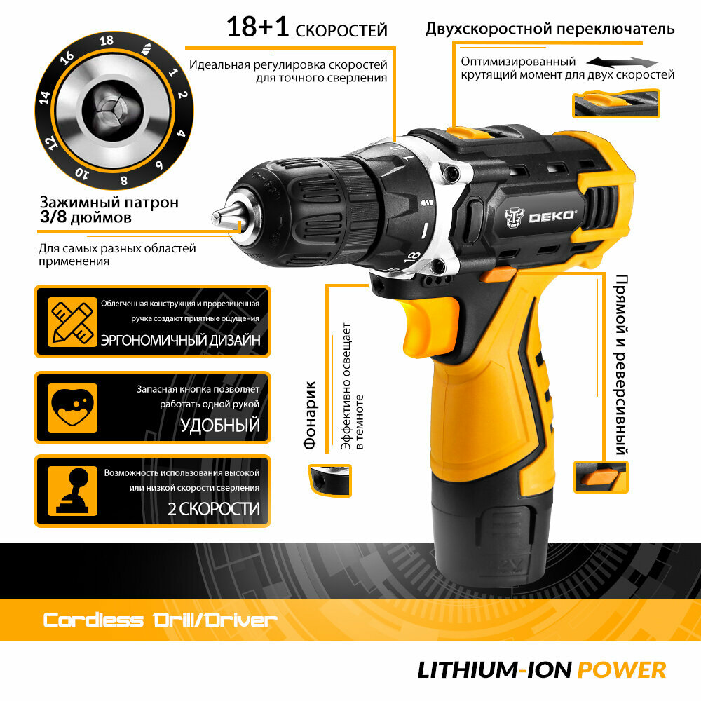 Дрель-шуруповерт DEKO DKCD12FU-Li 2Ач, с одним аккумулятором [063-4112]