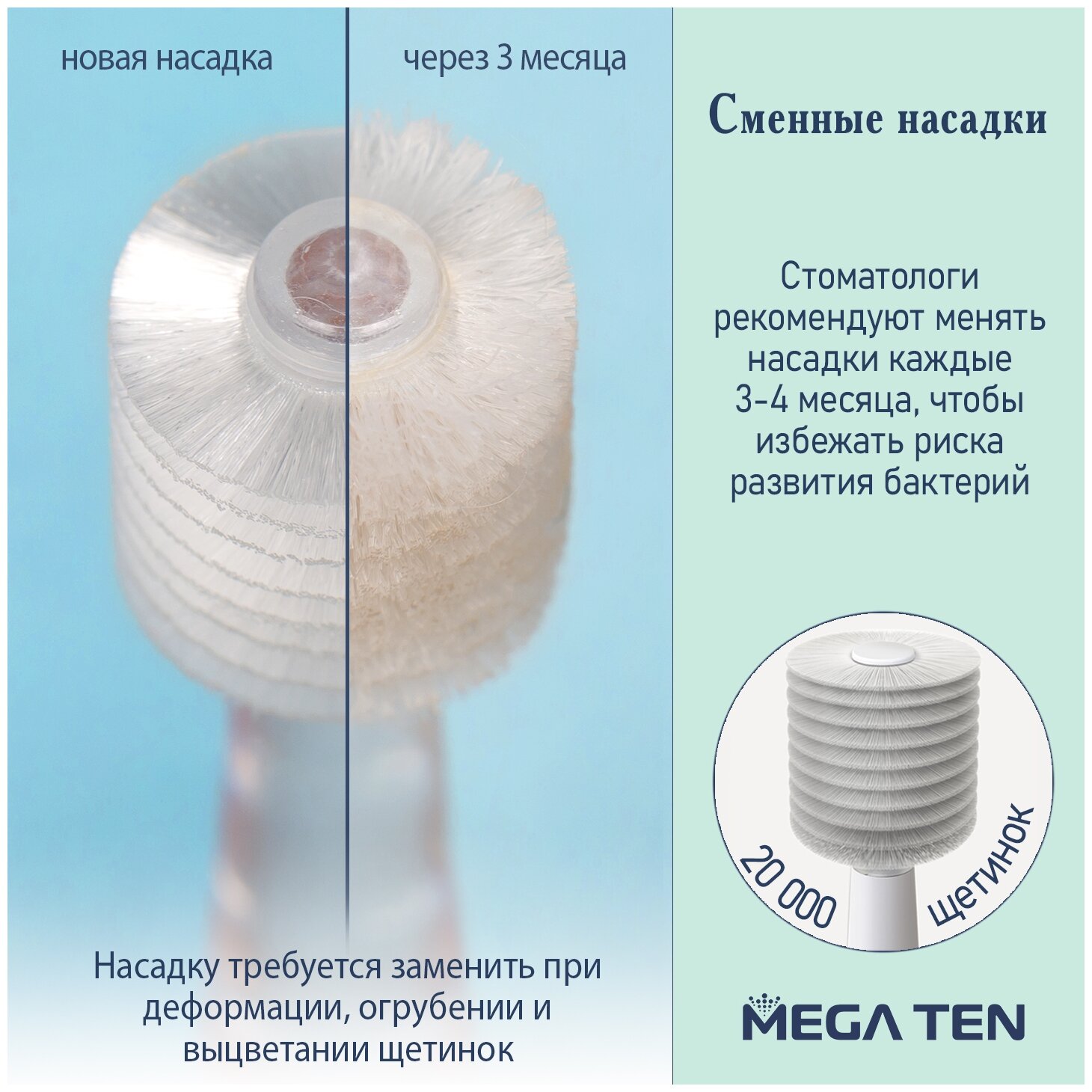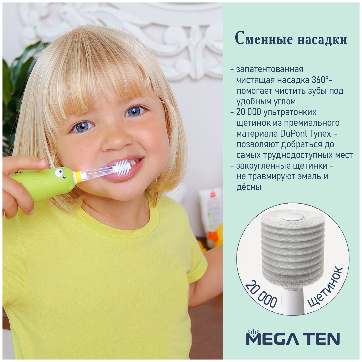 Лучшие цены. Сменные насадки MEGA TEN kids sonic с технологией 360 градусов, подходят к детским электрическим зубным щеткам Mega Ten kids sonic. Технология насадки разработана в Университетской стоматологической клинике г. Осака, Япония и запатентована. Страна - изготовитель: Япония 1. Обладают мягкой круговой щетиной, состав – высококачественный премиальный нейлон Dupont™ Tynex®. 2. Магазины в вашем городе.