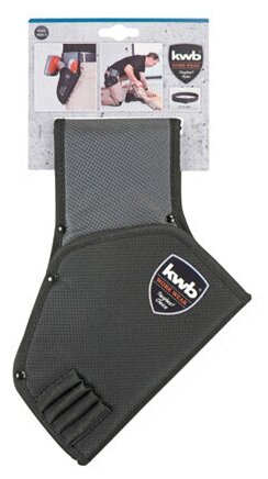 Лучшие цены. Держатель для шуруповерта KWB 21х15х10см. Держатель для аккумуляторного шуруповёрта из нейлона 1680D чёрного/серебристого цвета, повышенной прочности. Двойной шов, с контрастной серебристой нитью. На внешней стороне четыре ячейки на резинке для свёрл. Для правшей. Подходит для всех стандартных аккумуляторных шуруповёртов. С эмблемой 'Work wear' компании 'KWB'. Для пояса шириной до 7 см. Размеры: 210х150х100 мм. Магазины в вашем городе.
