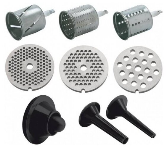 | Насадки | 3 диска для фарша / 3 насадки для нарезки/шинковки / для кеббе / для домашних колбас 2 шт |