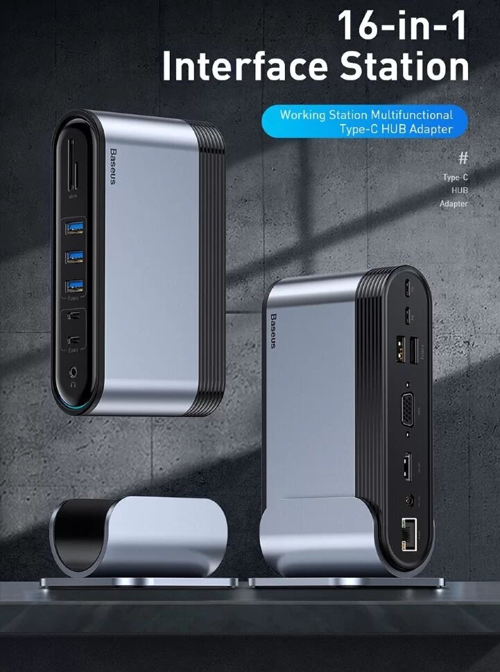 USB концентратор Baseus Working Station 16-in-1 Type-C to 2xUSB2.0+3xUSB3.0+4xType-C+4K HDMI+VGA+RJ45+SD CAHUB-BG0G Dark Gray