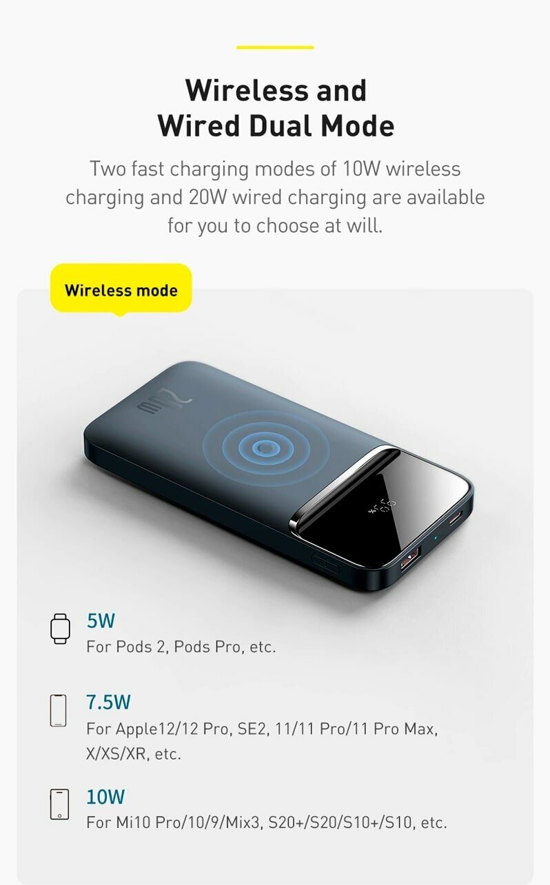 Портативный аккумулятор BASEUS Magnetic Wireless 20W с беспроводной быстрой зарядкой 15W, 10000 mAh, Синий