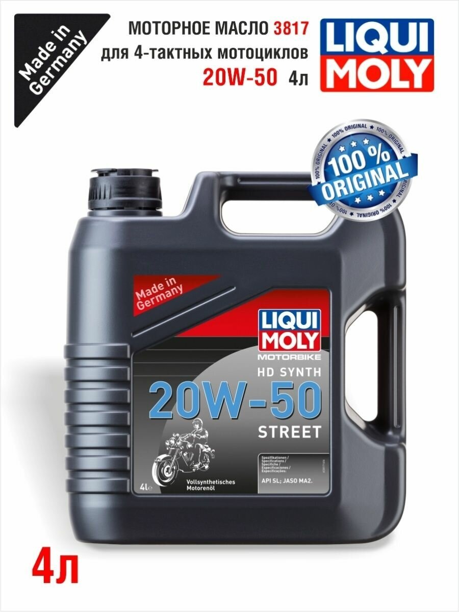 Лучшие цены. Масло моторное для 4-тактных мотоциклов 20W-50 Motorbike 4T Street 4л LIQUI MOLY 1696 Для эксплуатации шоссейной мототехники на дорогах с твердым покрытием. Универсального применения, преимущественно для низкооборотных мотодвигателей с воздушным охлаждением. Для классических и коллекционных ретро-мотоциклов. Особенности: Использована высоковязкая минеральная базовая основа, обладающая стойкостью к перегреву и потере вязкости. Магазины в вашем городе.