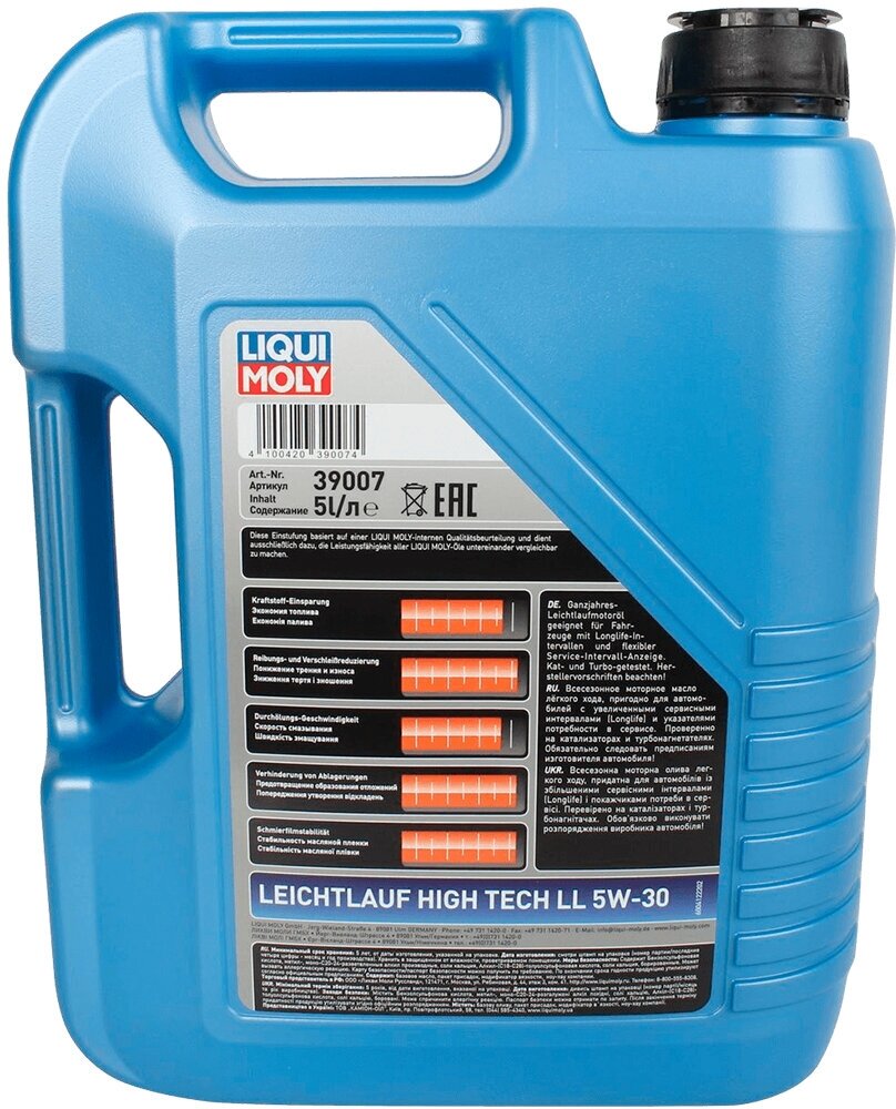 LIQUI MOLY 39007 Масло моторное LIQUI MOLY Leichtlauf High Tech LL гидрокрекинг 5W-30 SL/CF 5л.