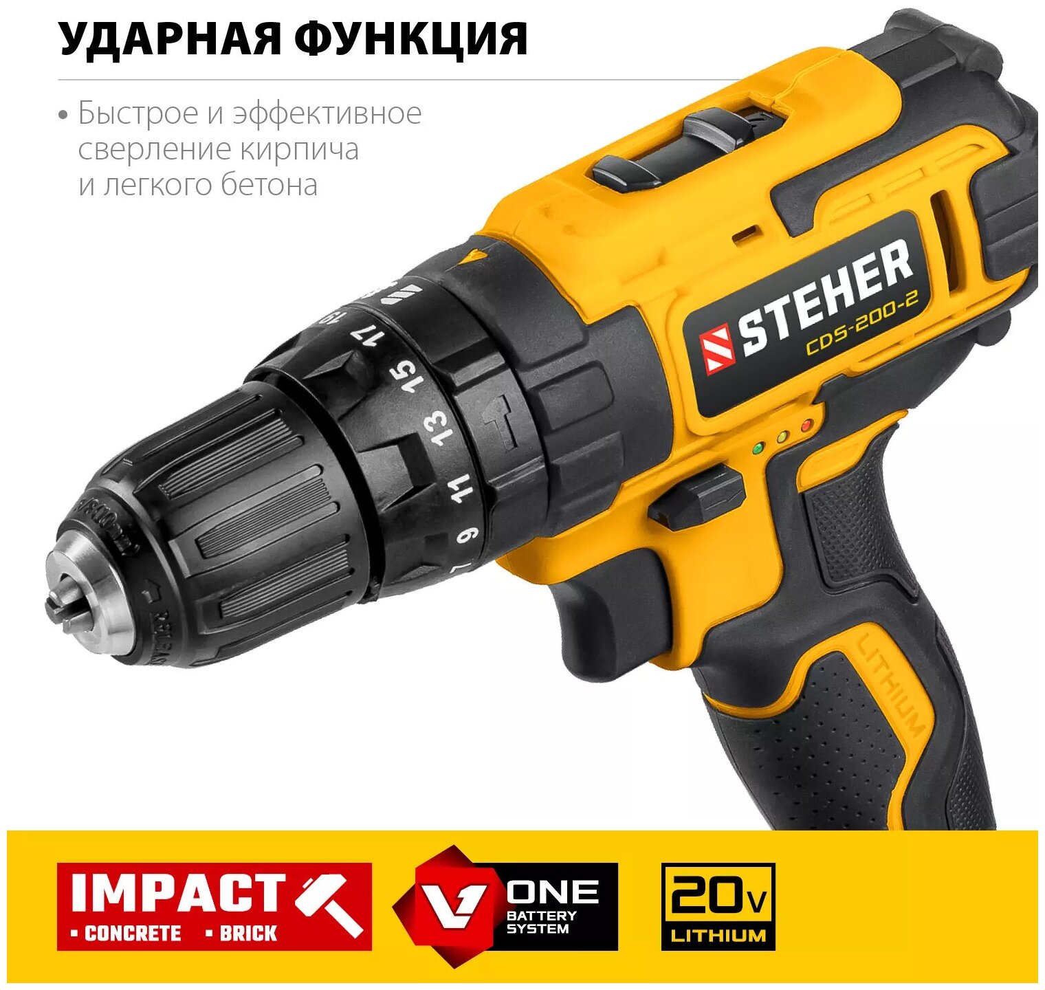 Ударная дрель-шуруповерт STEHER 20В 2 АКБ 2Ач-2 (CDS-200-2)