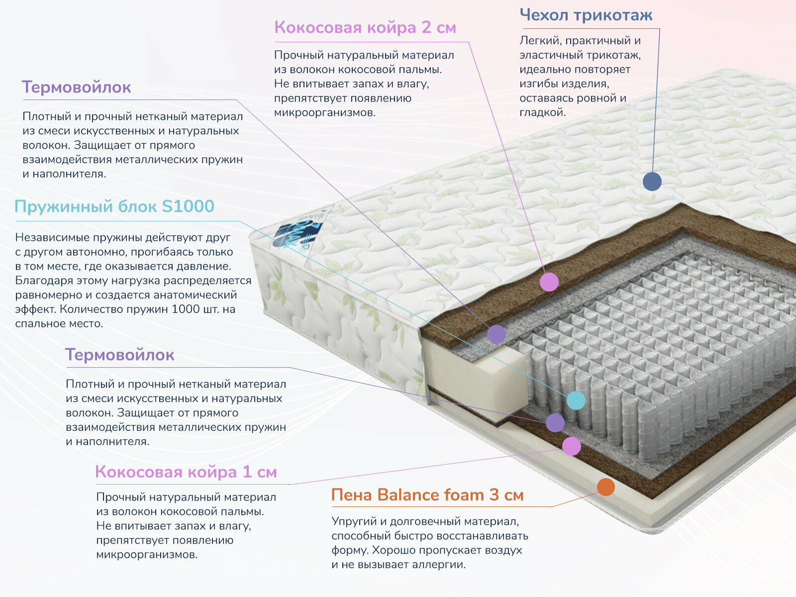 Лучшие цены. Матрас для больших нагрузок со сторонами выше средней жесткости. Пружинный блок «мультипакет» и сочетание разных наполнителей создают анатомический эффект по доступной цене. Одна сторона с 2-см слоем кокосовой койры. Латексированная кокосовая койра отличается долговечностью, прочностью и способностью много лет сохранять форму при ежедневных нагрузках. При болях в спине рекомендуется спать именно на этой стороне матраса. Вторая сторона: кокосовая койра (1 см). Магазины в вашем городе.
